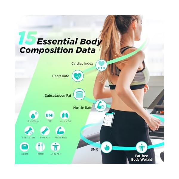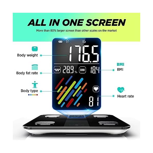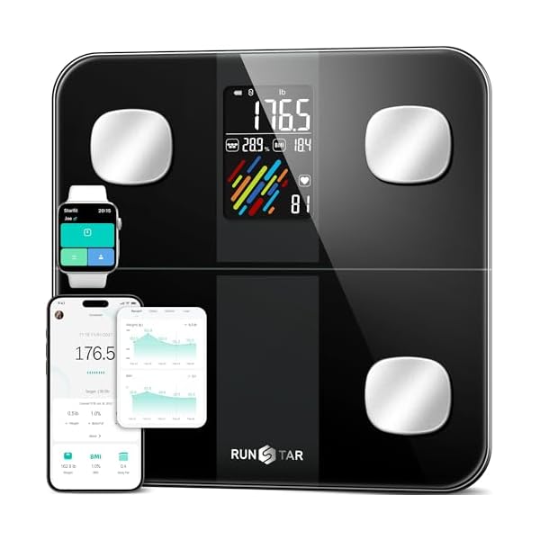 Pantalla Todo en Uno: A diferencia de las básculas inteligentes de aceite corporal convencionales, la báscula RunSTAR, con su pantalla VA extragrande, te permite conseguir 5 métricas corporales clave incluso sin tu teléfono. La pantalla acuse el peso, el índice de aceite corporal, el IMC, la frecuencia cardíaca y el tipo de cuerpo simultáneamente en 15 segundos. Tendrás las manos completamente libres para conocer tu estado de salud básico de un vistazo.