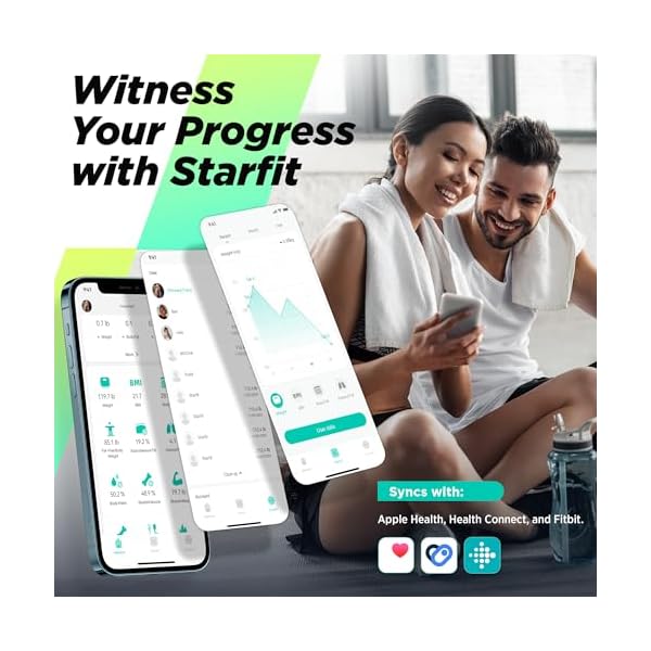 APP multifuncional: Descarga la App Starfit desde la App Store o Google Play para monitorizar y desempeñarse un cortejo de tus datos corporales en cualquier momento y lugar. La aplicación también se sincroniza fácilmente con otras aplicaciones de fitness como Apple Health, Health Connect y Fitbit. Además, la báscula inteligente admite la medición sin ensamblaje, lo que permite que los datos se midan y se sincronicen automáticamente con la aplicación después de la primera medición.