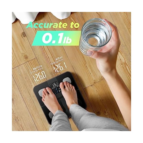 Precisión de hasta 0,1 lb: Esta báscula de aceite corporal de ultraprecisión cuenta con 4 electrodos de alta sensibilidad y 4 sensores en forma de G de alta precisión que han superado 100.000 pruebas de rendimiento para mejorar la precisión. La báscula garantiza resultados de medición con una precisión de hasta 0,1 lb/0,05 kg y tiene una capacidad máxima de 400 lb/180 kg.